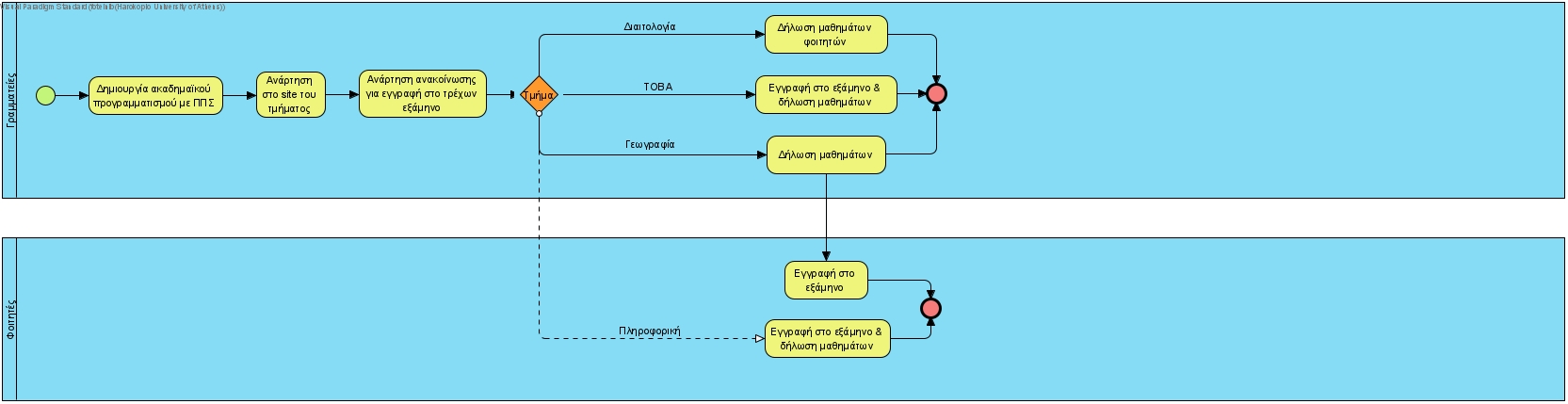 ¶ ΠεριγραφήΗ διαδικασία αφορά στον προγραμματισμό του ακαδημαϊκού έτους και του τρόπου δήλωσης μαθημάτων βάσει τμήματος. |